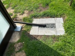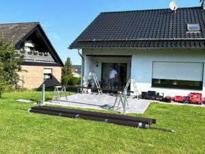 Wunsch der Kunden war es, die neu angelegte Terrasse mit einer Überdachung zu versehen. Hierfür wurden zunächst außerhalb der Terrasse in der Front zwei Punktfundamente auf Frosttiefe für die Stützen der Überdachung erstellt.