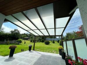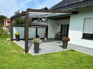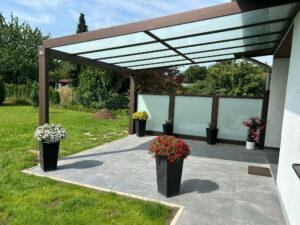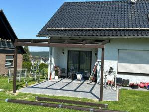 Die Kunden erhielten eine Terrassenüberdachung im Farbton rostiges Eisen, welcher dem Farbton der vorhandenen Fensterelemente ähnelt und somit ein harmonisches Gesamtbild vermittelt.