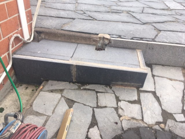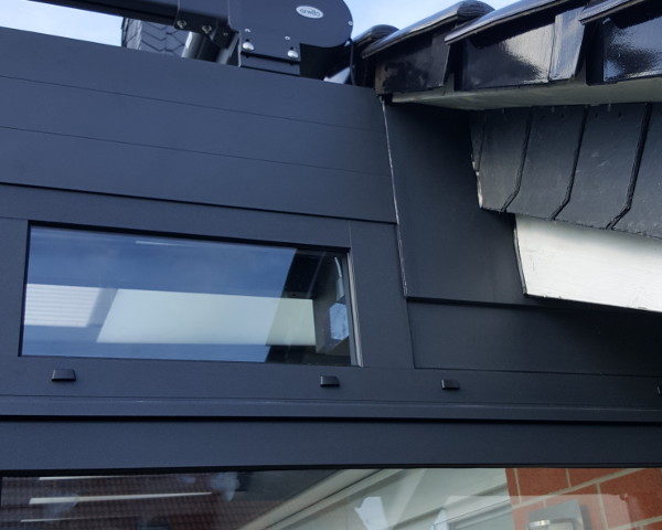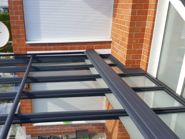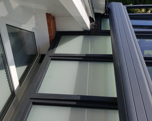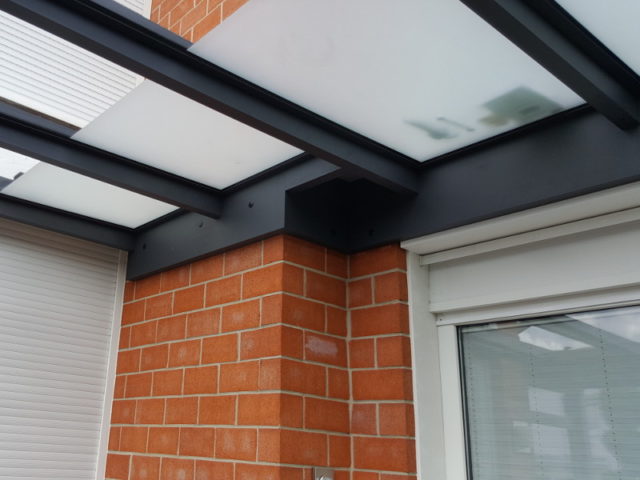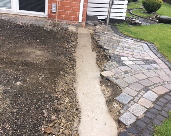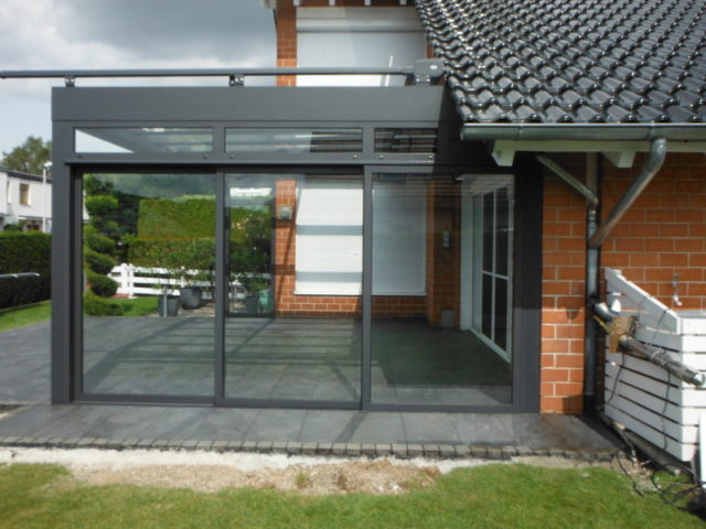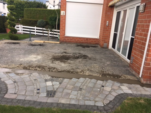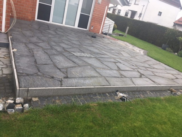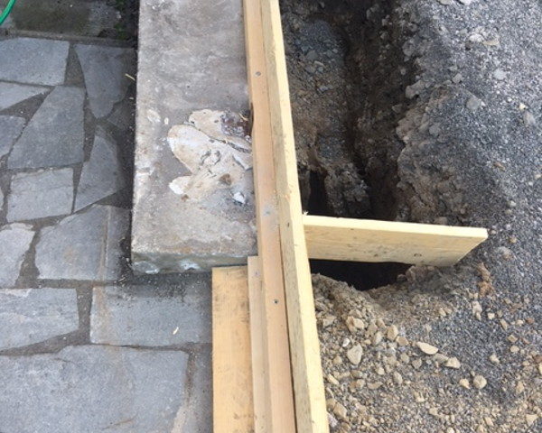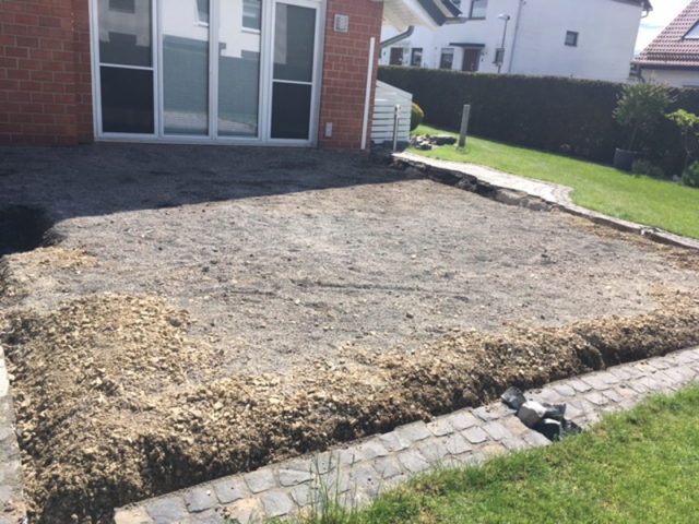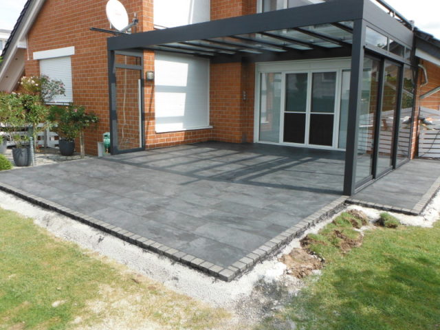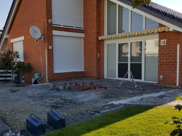 Hier entsteht ein Terrassendach mit Seitenteil. Der Terrassenboden wird in diesem Zusammenhang ebenfalls neu gestaltet.