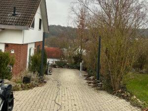 Hierfür wurde zunächst an sechs Stellen das Pflaster aufgenommen, um dort entsprechende Punktfundamente auf Frosttiefe für die Stützen des Carports zu erstellen. Das Pflaster wurde dann, nach Abschluss aller Arbeiten, wieder entsprechend verlegt.