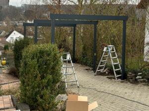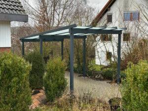 Wunsch der Kunden war es, die neben dem Haus befindliche Parkfläche mit einem Carport zu überdachen. Auf Grund der örtlichen Gegebenheiten, sollte dieser freistehend montiert werden.