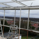 Zunächst musste erst einmal die vorhandene Stahlkonstruktion demontiert werden. Nachdem sämtliche vorbereitenden Arbeiten abgeschlossen waren, wurden die neuen Elemente mittels Krans an ihren neuen Bestimmungsort im Obergeschoss gehoben. Dies ermöglichte es unseren Monteuren, dass die Grundkonstruktion des Sommergartens bereits am selben Nachmittag vormontiert war.