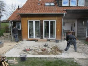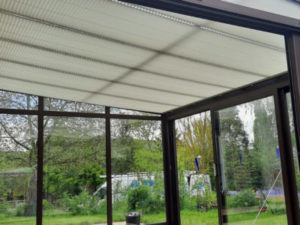 Der vorhandene Terrassenbelag wurde im Bereich der geplanten senkrechten Elemente aufgeschlitzt und entfernt, so dass die Befestigung der Elemente auf dem Betonfundament gewährleistet werden konnte. Der Sommergarten erhielt sowohl in der Front als auch auf der linken Seite eine 2/3 Schiebe-Elementtür; diese ermöglichen es den Kunden den Sommergarten bei warmen Wetter großflächig zu öffnen, ohne dabei Nutzfläche im Raum zu verlieren. Die Verglasung erfolgte mit Isolierglas. Der Dachbereich erhielt zusätzlich Verbundsicherheitsglas, sowie Sonnenschutzglas. Zusätzlich kann der Dachbereich außerdem über die vorgesehenen Plafondanlagen (Plissee) von innen beschattet werden. Diese können einzeln mittels Kurbel manuell ein- und ausgefahren werden. Abschließend wurde die Hausfassade im Sommergarten mit Lärchenholz neu verkleidet. Die Kunden können nun auch an windigen Sonnentagen Ihren Garten in vollen Zügen genießen.