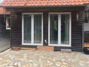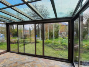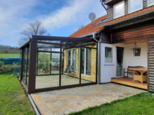 Sie entschieden sich daher für einen Sommergarten im Farbton rostiges Eisen, welcher sich farblich an die Holzverkleidung der Hausfassade anpasst.