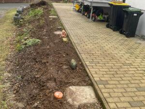 Hierfür wurden zunächst, für die Stützen der Überdachung, außerhalb der gepflasterten Fläche vier Punktfundamente auf Frosttiefe erstellt.