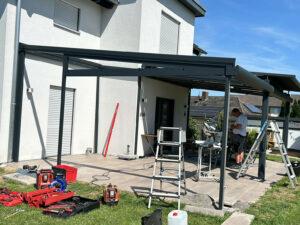 Die Montage des textilen Daches erfolgt in mehreren Schritten. Zuerst werden die Halterungen für das neue Dach an den vorhandenen Strukturen befestigt, sowie die Unterkonstruktion für die Beschattungsanlage montiert. Anschließend wird die Markisenanlage installiert.