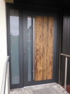 Der Türflügel erhielt eine flügelüberdeckende Türfüllung mit planflächiger Echtholzapplikation außen. Die Innenansicht ist weiß. Abgerundet wurde das Ganze durch einen 1,60 m langen Edelstahlstoßgriff.