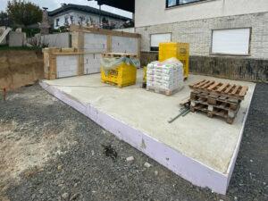 Das vorhandene Erdreich wurde soweit abgetragen, dass der Fußboden des Wintergartens mit dem des dahinterliegenden Wohnraumes übereinstimmt. Die vorhandenen Riemchen des Hauses wurden ebenfalls entfernt. Auf der linken Seite wurde eine abgestufte Mauer zum Abfangen des Erdreiches auf der neu erstellten Bodenplatte vorgesehen. Sowohl die Mauer als auch die Bodenplatte wurden wärmegedämmt ausgeführt. Der Hang außerhalb des Wintergartens wurde mit L-Steinen abgestützt.