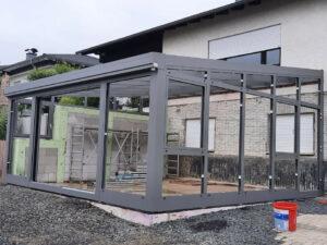 Nach Abschluss der Vorarbeiten erfolgte die Montage der Wintergartenkonstruktion. Die Kunden entschieden sich hierbei für einen grauen Farbton, welcher einen sanften Kontrast zur übrigen Optik des Hauses bildet. Die Verglasung erfolgte mit einer Dreifachverglasung, welche im Oberlicht auf der linken Seite mit matter Folie ausgeführt wurde. Die senkrechte Front erhielt die zusätzliche Funktion Sonnenschutzglas.