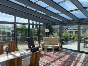 Der Wintergarten wurde mit drei gegenüberliegenden Dreh-Kippfenstern ausgestattet, welche eine optimale Querlüftung ermöglichen. Des Weiteren erhielt er in der Front eine Hebe-Schiebetür, welche den Raum zu der davorliegenden Terrasse öffnet und beides somit optimal miteinander verbindet. Außerdem wurde auf der rechten Seite eine nach außen öffnende Haustür integriert, um den Wintergarten zukünftig auch als Hauseingang nutzen zu können.