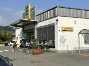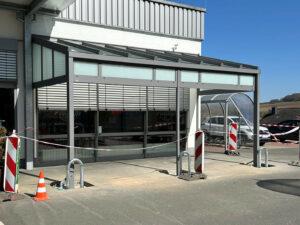 Modernes Terrassendach aus Aluminium und Glas für die Außenterrasse eines Lebensmittelgeschäfts in Vöhl