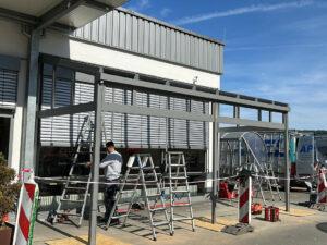 Das Trägersystem des Terrassendachs besteht vollständig aus pulverbeschichtetem Aluminium, das für seine Witterungsbeständigkeit, Langlebigkeit und Pflegeleichtigkeit bekannt ist. Die klaren Linien und das zurückhaltende Design fügen sich harmonisch in die bestehende Architektur des Geschäfts ein und unterstreichen den modernen Anspruch des Unternehmens.