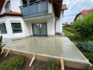 Hierfür wurden die vorhandene Terrasse sowie die Begrenzungsmauer demontiert, so dass eine Bodenplatte vorbereitet und gegossen werden konnte.