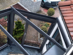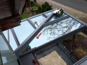 Die Verglasung erfolgte mit klarem Verbundsicherheitsglas. Der Walmbereich erhielt zusätzlich Stopsol Silver. Die gerade Hauptdachfläche wurde anschließend mittels einer Markise beschattet, welche automatisch über eine Steuerung angesteuert wird. Zusätzliche erhielten die Front und die rechte Seite ZipScreenanlagen als Sicht- und Lichtschutz.
