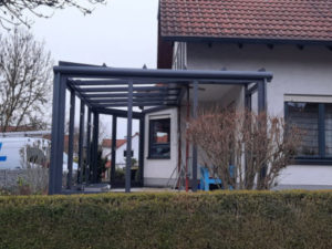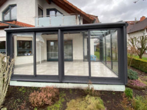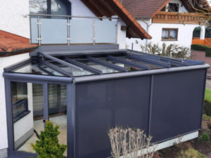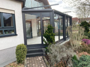 Die Kunden erhielten einen Sommergarten im Farbton DB703. Dieser erhielt links eine gebrochene Ecke, sodass der Anschluss an den Hauserker gegeben werden konnte. Außerdem wurde das Dach auf der rechten Seite abgewalmt und um die Ecke bis zum Ende der überdachten Hausnische weitergeführt.