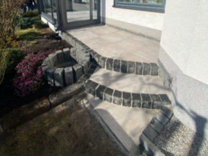 Nach Abschluss der Montage wurde im Sommergarten ein neuer Bodenbelag verlegt und die vorbereiteten Fußbodensteckdosen moniert. Außerdem wurde auf der linken Seite eine neue Treppe bestehend aus anthrazitfarbenen Blockstufen erstellt und im hinteren Bereich eine neue Außenterrasse angelegt. Diese erhielt eine halbrunde Stufe in den Garten, sowie ein aus Palisaden erstelltes Rundbeet, welches dem Ganzen eine besondere Note verleiht.