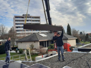 Hierfür wurde die Überdachung bereits im Vorfeld vormontiert und anschließend mittels Krans in einem Stück auf dem Hausdach platziert.