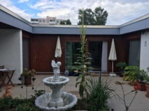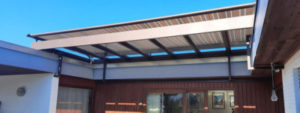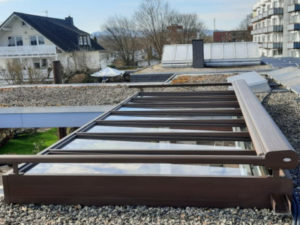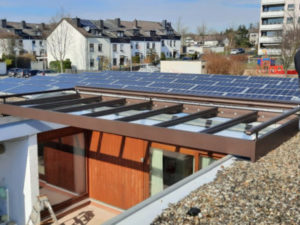 Wunsch der Kunden war es, den Terrassenbereich teilweise zu überdachen, um ihn somit auch an wechselhaften Tagen nutzen zu können. Die Kunden entschieden sich für eine Überdachung im Farbton „rostiges Eisen“, welche dreiseitig auf dem Flachdach des Hauses montiert wurde.