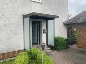 Anschließend erhielten die Kunden ein neues Vordach mit Seitenteilen. Sie entschieden sich für die Kombination aus Aluminium im Farbton RAL 9007 graualuminium pulverbeschichtet und der Verglasung mit Verbundsicherheitsglas mit matter Folie. Die Untersichtverkleidung des Daches erfolgte mit Aluminium-Paneelen im Farbton RAL 9006 weißaluminium.