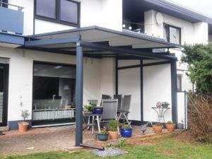 Die Kunden entschieden sich für ein Terrassendach welches im RAL Farbton 7016 anthrazitgrau pulverschichtet wurde. Somit passt es sich harmonisch an die vorhandene Geländerkonstruktion des Balkons an.