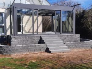Die Terrasse wurde teilweise abgetragen, um die benötigten Streifenfundamente erstellen zu können. Anschließend wurden zwei abgestufte Mauern erstellt. Die hintere Mauer dient zur Abstützung der Bodenplatte und wurde aus diesem Grund zusätzlich ausbetoniert. Die untere Mauer gleicht den übrigen Hang aus. Der Bereich zwischen den Mauern wurde abschließend mit Mutterboden befüllt und dient den Kunden nun als Pflanzbeet. Des Weiteren wurde die benötigte Bodenplatte erstellt, sowie eine Treppe mit Blockstufen, welche den direkten Zugang zum Garten ermöglicht.