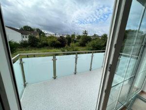 Der Balkonbelag aus balkoFloor-Aluminiumprofilen im Dekor Granit Hell ist eine praktische Entscheidung, da er rutschhemmend und kratzfest ist, was die Sicherheit und Langlebigkeit erhöht.
