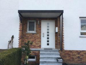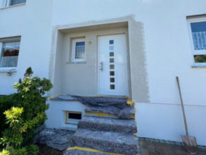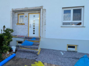 Hierfür wurden zunächst die vorhandene Vordachkonstruktion sowie die vorhandenen Riemchen demontiert. Anschließend wurden die Hausniesche sowie die Hausfassade im Bereich der entfernten Riemchen verputzt und gestrichen.