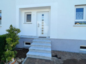 Die beiden Kellerfenster im Bereich des Haussockels erhielten neue Granit-Außenfensterbänke, passend zu den übrigen Hausfenstern. Die Treppenwange sowie der Haussockel wurden danach mit Buntsteinputz neu verputzt.