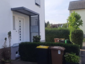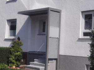 Der Eingangsbereich erhielt ein neues Vordach mit Seitenteil. Die Dachausführung erfolgte als Flachdach mit integriertem Gefälle. Die Rahmenkonstruktion des Daches und des Seitenteils wurde im RAL Farbton 9007 pulverbeschichtet. Die Aluminiumpaneele des Daches, sowie der integrierte Briefkasten und die Aluminiumsprossen des Seitenteils wurden hingegen im RAL Farbton 9006 pulverbeschichtet. Somit wirkt die Konstruktion, trotz der dunkleren Farbtöne, locker und leicht.