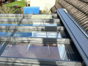 Der Dachbereich unterhalb des Markisenkastens wurde mit passenden Blindfeldern gestaltet, die pulverbeschichtet sind und sich nahtlos in die Terrassendachkonstruktion einfügen. Diese Lösung verhindert einen direkten Blick unter den Markisenkasten, welcher ansonsten mitten in der Glasfläche zu sehen wäre.