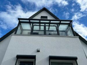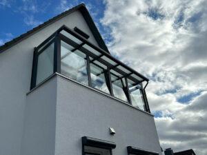 Anschließend erhielt der Balkon einen Sommergarten im Farbton RAL 7016 anthrazitgrau. Der Dachbereich wurde mit Verbundsicherheitsglas mit matter Folie verglast.