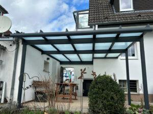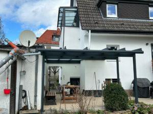 Die Terrasse erhielt eine neue Überdachung, welche dem Verlauf des Hauses angepasst wurde. Diese wurde ebenfalls im Farbton RAL 7016 anthrazitgrau beschichtet und mit Verbundsicherheitsglas mit matter Folie verglast.
