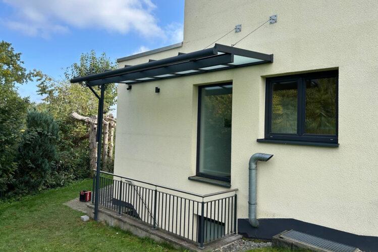 Moderner Wetterschutz mit Stil: Hauseingangsüberdachung in RAL 7032 mit Edelstahlhandlauf in Kasselweiterlesen »