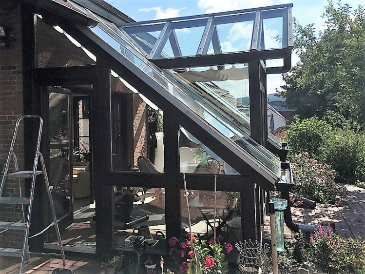 Bei diesem Bauprojekt fanden wir einen alten Holzwintergarten vor. Aufgrund der extrem geneigten Dachschrägen dieser Konstruktion konnte unser Kunde den Innenbereich seines Wintergartens nicht voll nutzen. Ein aufrechtes Stehen im Bereich der Dachschrägen war nicht möglich.