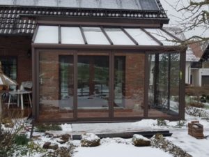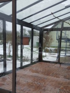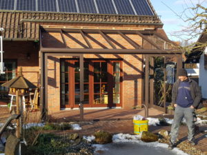 Wir haben daher die gesamte vorhandene Holzkonstruktion demontiert und entsorgt. Bevor wir mit dem Aufbau der neuen Konstruktion beginnen konnten, musste der Bodenbereich noch begradigt und ausgebessert werden. Die neue Konstruktion des Sommergartens wurde im Farbton „rostiges Eisen“ angefertigt. Diese harmoniert optisch hervorragend mit dem Haus.